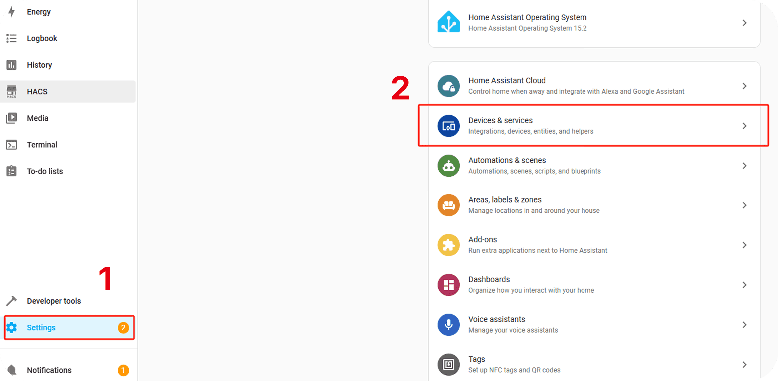 1. Wie im Bild gezeigt: Wählen Sie auf der linken Seite „Einstellungen“/"Setting" und klicken Sie anschließend auf „Geräte & Dienste“/"Devices & Services".