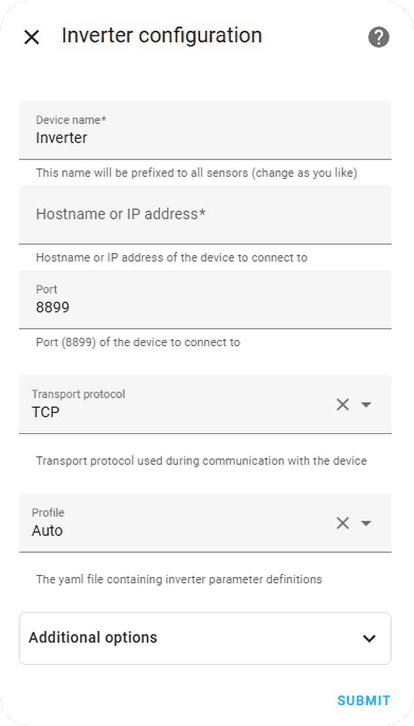 - Hostname oder IP-Adresse/Hostname or IP address: IP-Adresse des Deye-Wechselrichters eingeben Bezug der IP-Adresse des Gerätes