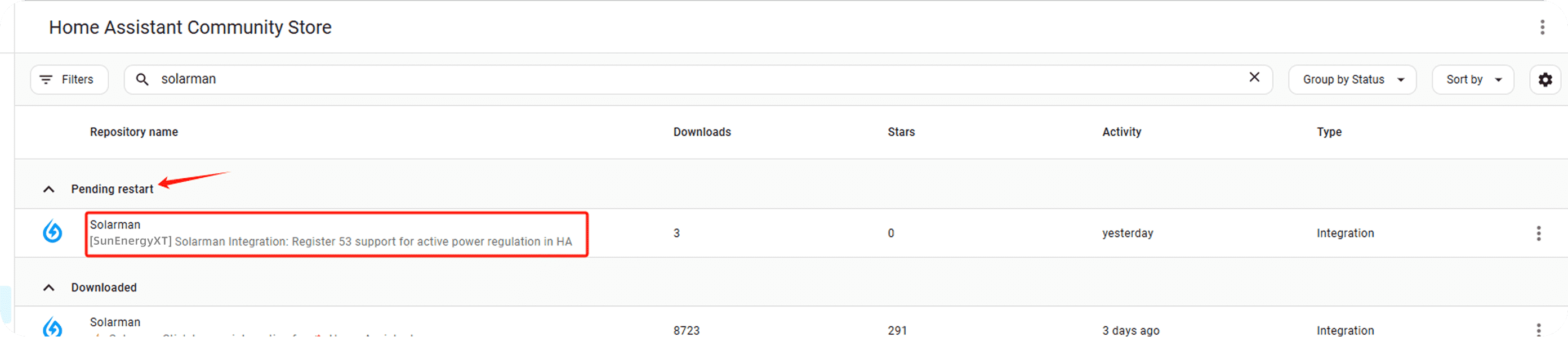 Nach dem Schließen des Download-Pop-up-Fensters erscheint das entsprechende Solarman-Plugin in der Kategorie „Pending restart“. Dies zeigt an, dass der Download- und Installationsprozess abgeschlossen ist.