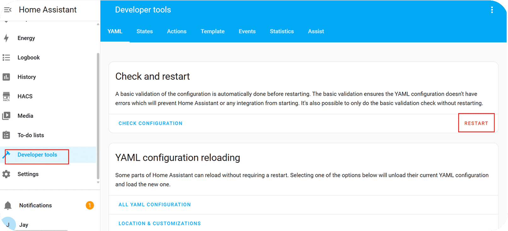 Nach Abschluss des Downloads wechseln Sie zur Seite „Entwicklerwerkzeuge“/"Developer tools" und klicken auf „Neustart“/"Restart". Wählen Sie dann im Pop-up-Fenster „Home Assistant neu starten“/"Restart Home Assistant".