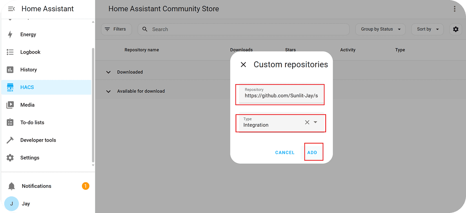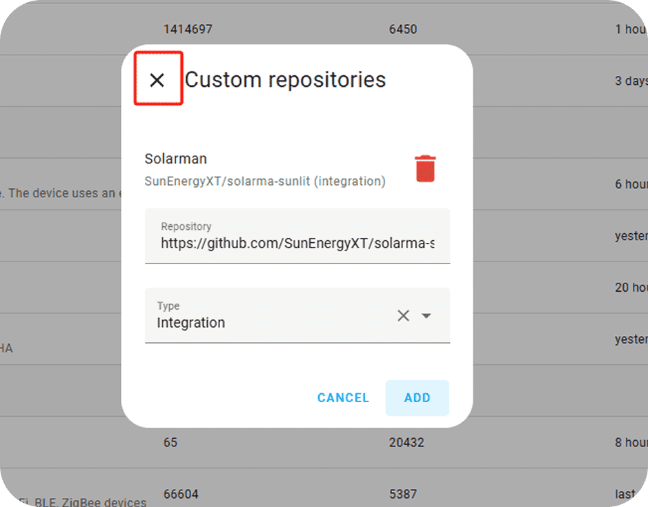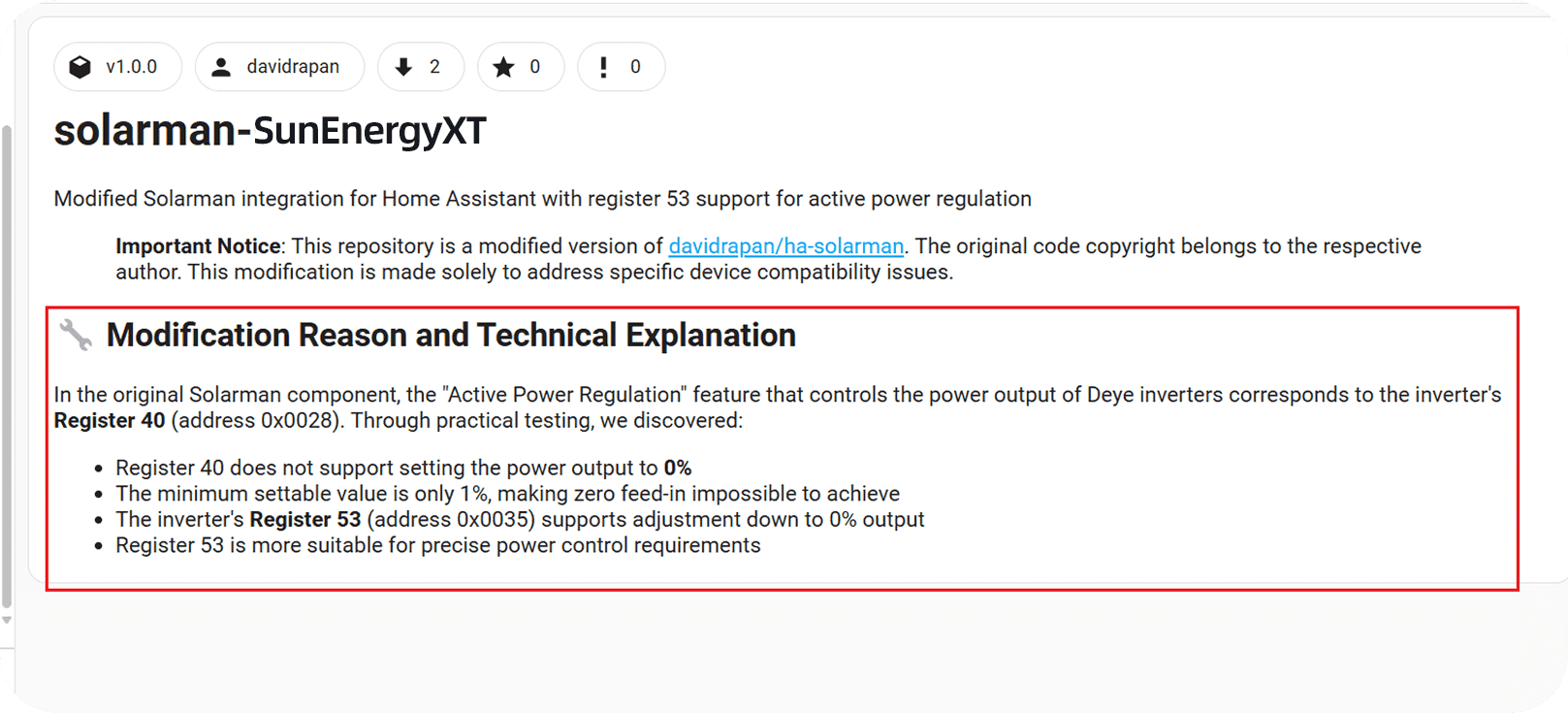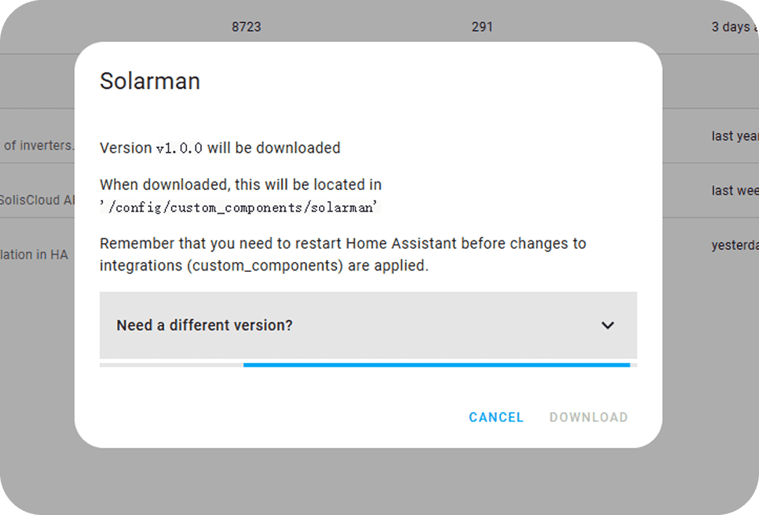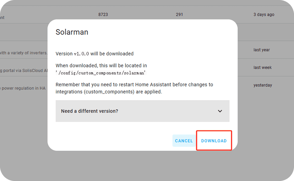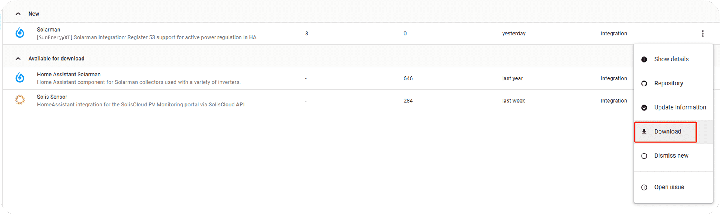 Hinweis: Falls die offizielle Solarman-Komponente bereits zuvor in HACS installiert wurde, überschreibt dieser Download die ursprüngliche Komponente. Weitere Details finden Sie in der Komponentenbeschreibung.