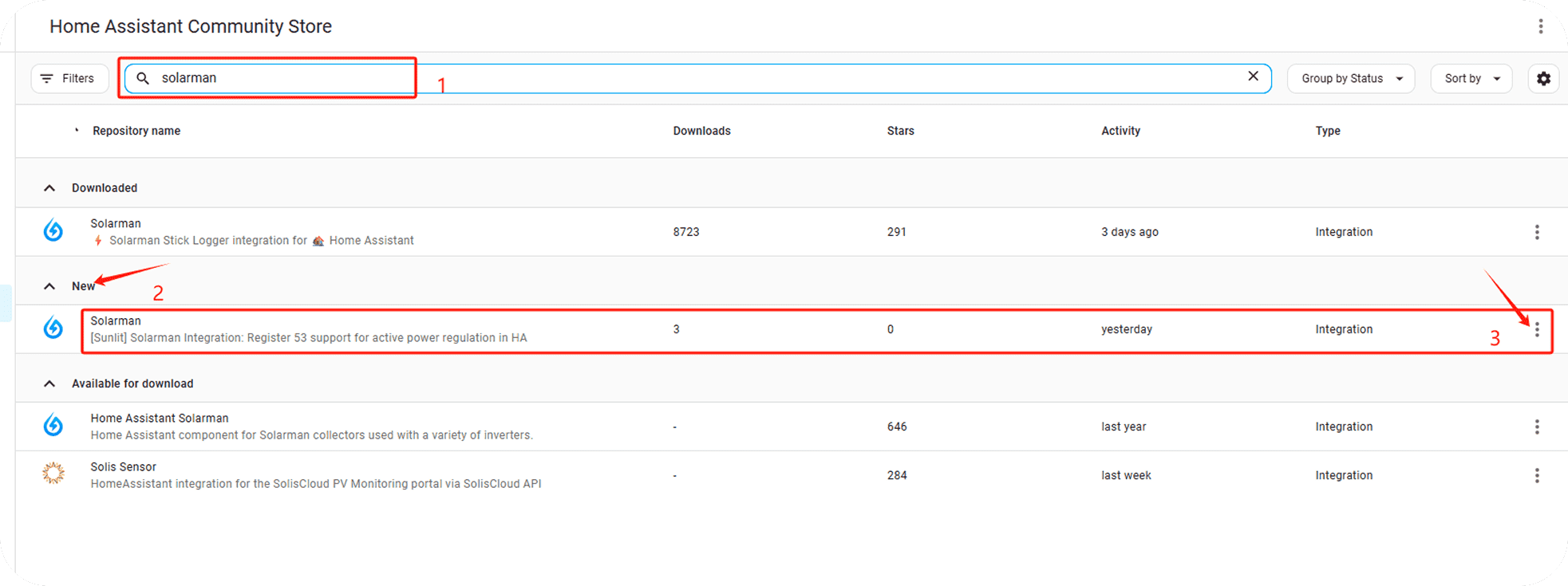 Geben Sie „Solarman“ in das Suchfeld (1) ein, suchen Sie dann unter der Kategorie „New“ nach „[SunEnergyXT] Solarman Integration…“ (2) und klicken Sie auf das „Mehr“-Symbol (3).