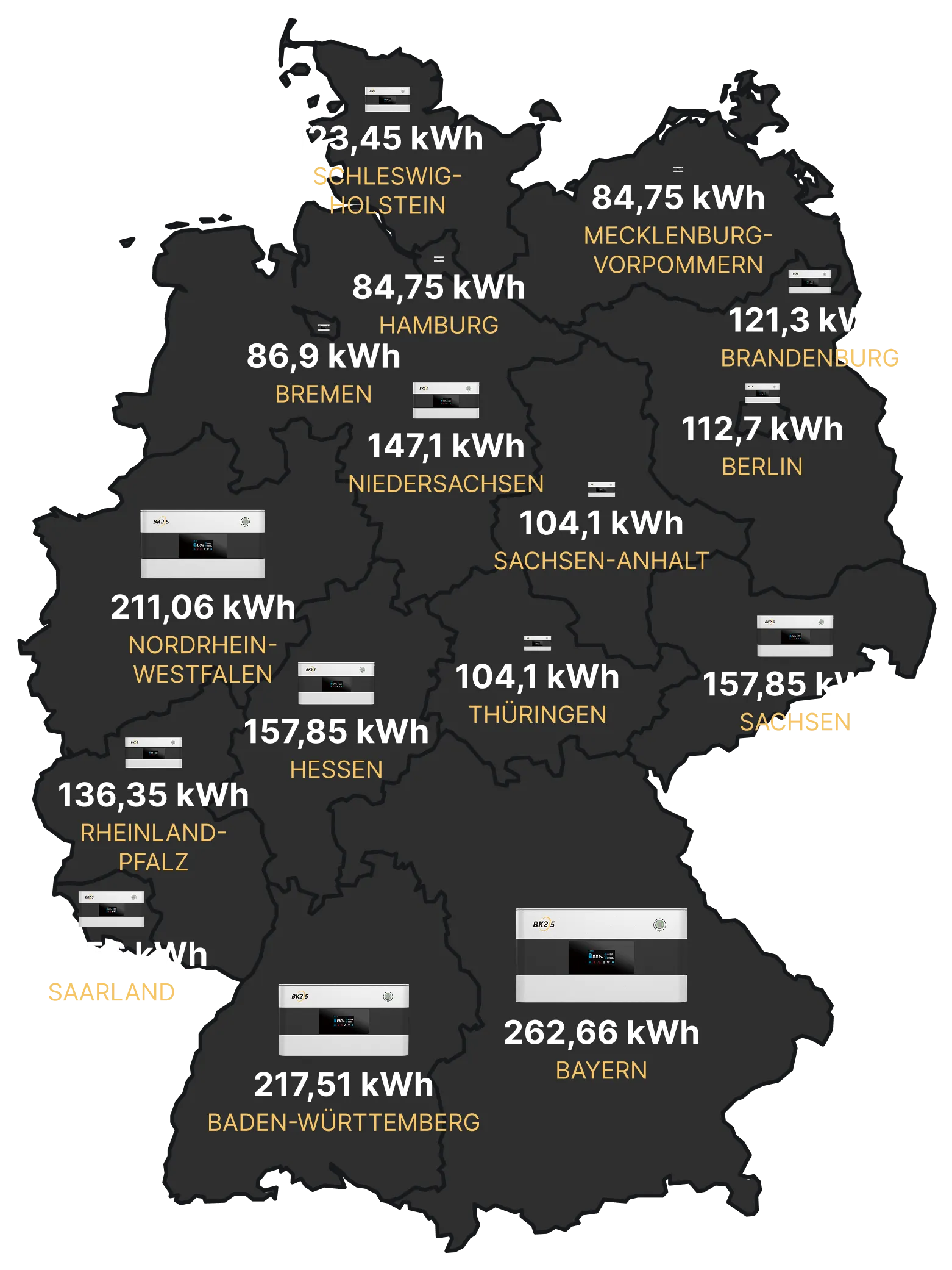 Damit Du sehen kannst, welche Speicherpower die Aktion bereits ans Netz gebracht hat, markieren* wir auf einer Deutschlandkarte die Verbreitung der 5 MWh-Aktions-Speicher.
