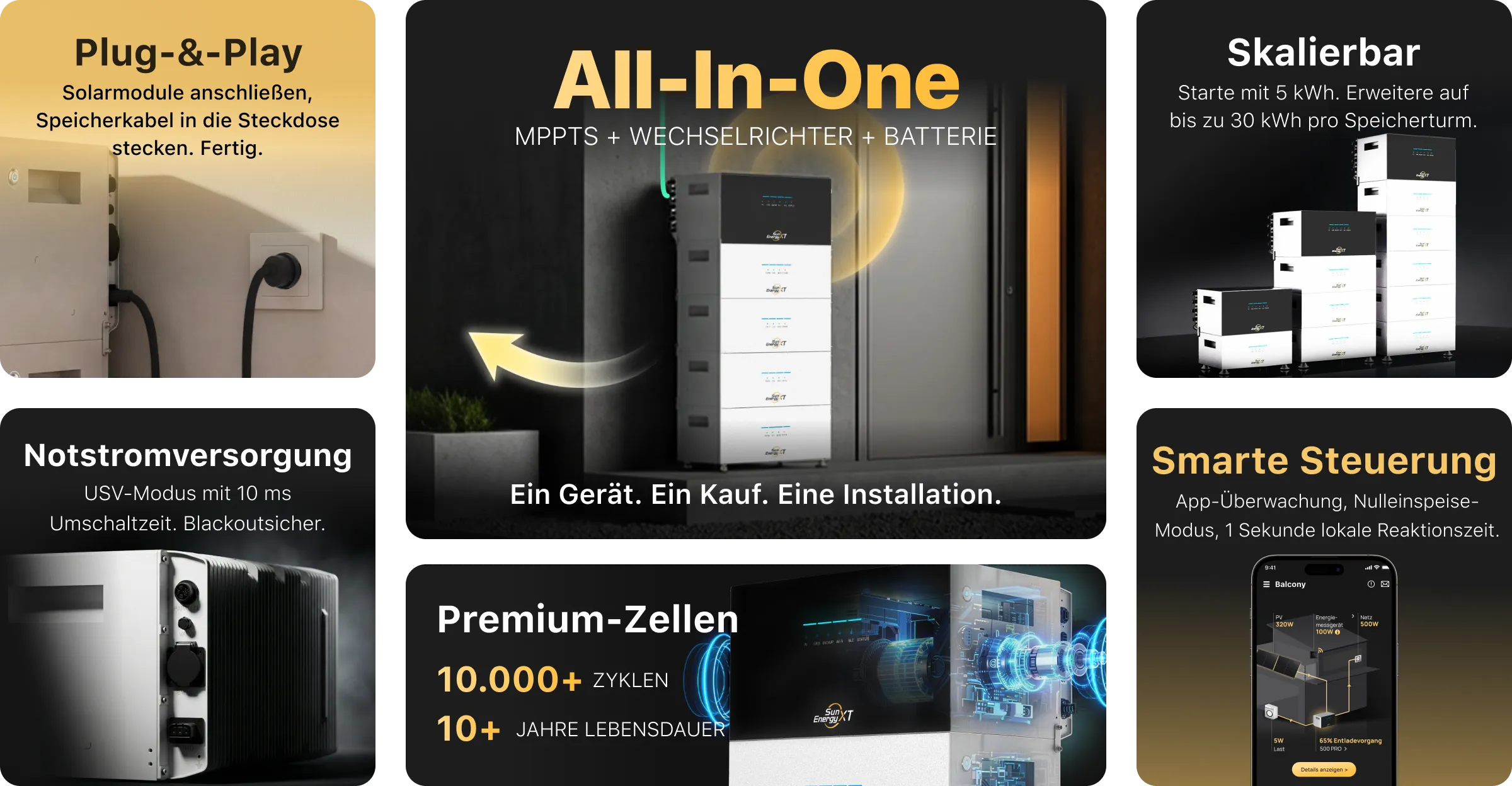 5 kWh Speicher. 2.400 W max. Ausgangsleistung. 4× MPPTs. Alles in einem Gerät. Einfach einstecken und loslegen.
