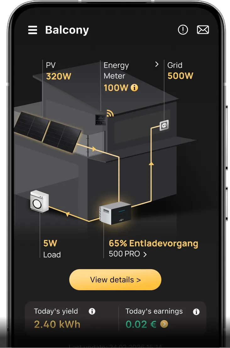 See PV input, battery status, grid feed-in, and house hold consumption live.