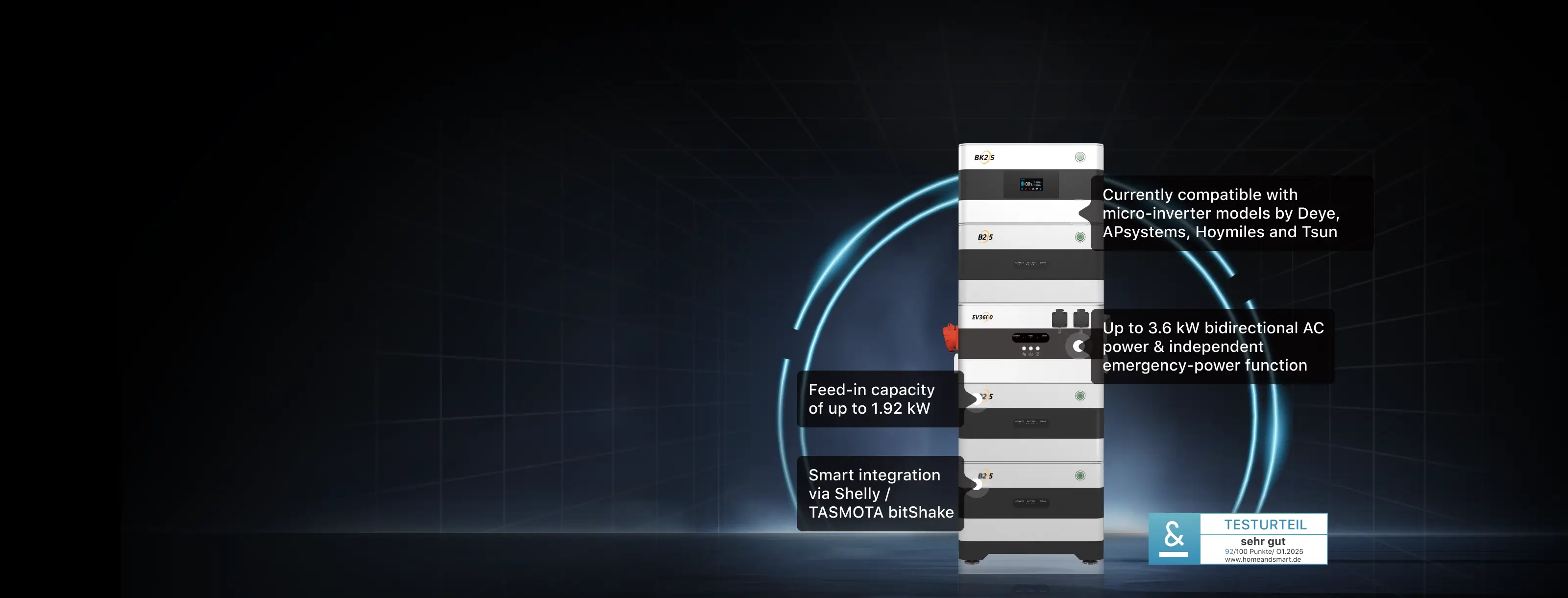 High-quality head storage with 2.15 kWh storage capacity, 2x outputs with up to 1,920 W max and 2x PV inputs up to 1,600 W for up to 4 solar modules (up to 400 W each)