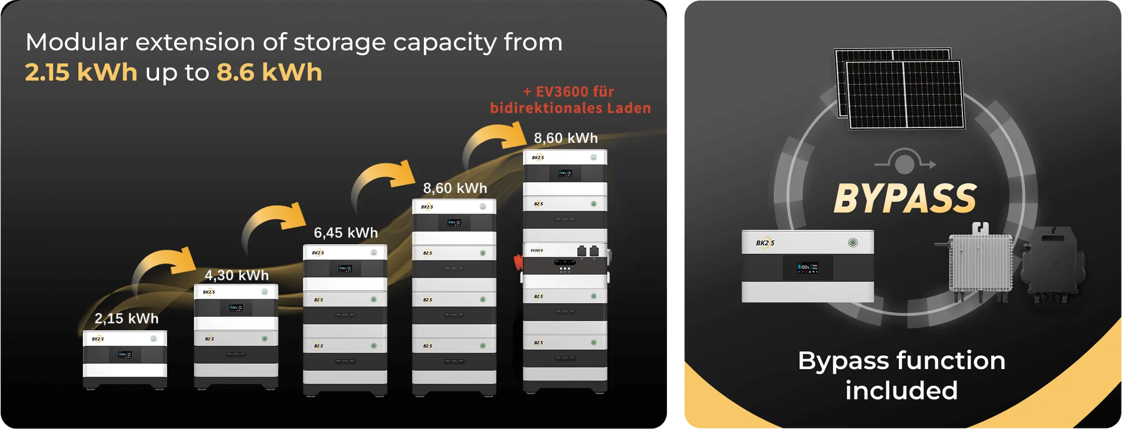 Der Wallbox-AC-Ausgang und somit der Autolade-Modus kann nur in Kombination mit einem BK215-Speicher und mindestens zwei B215-Erweiterungsspeichern verwendet werden.