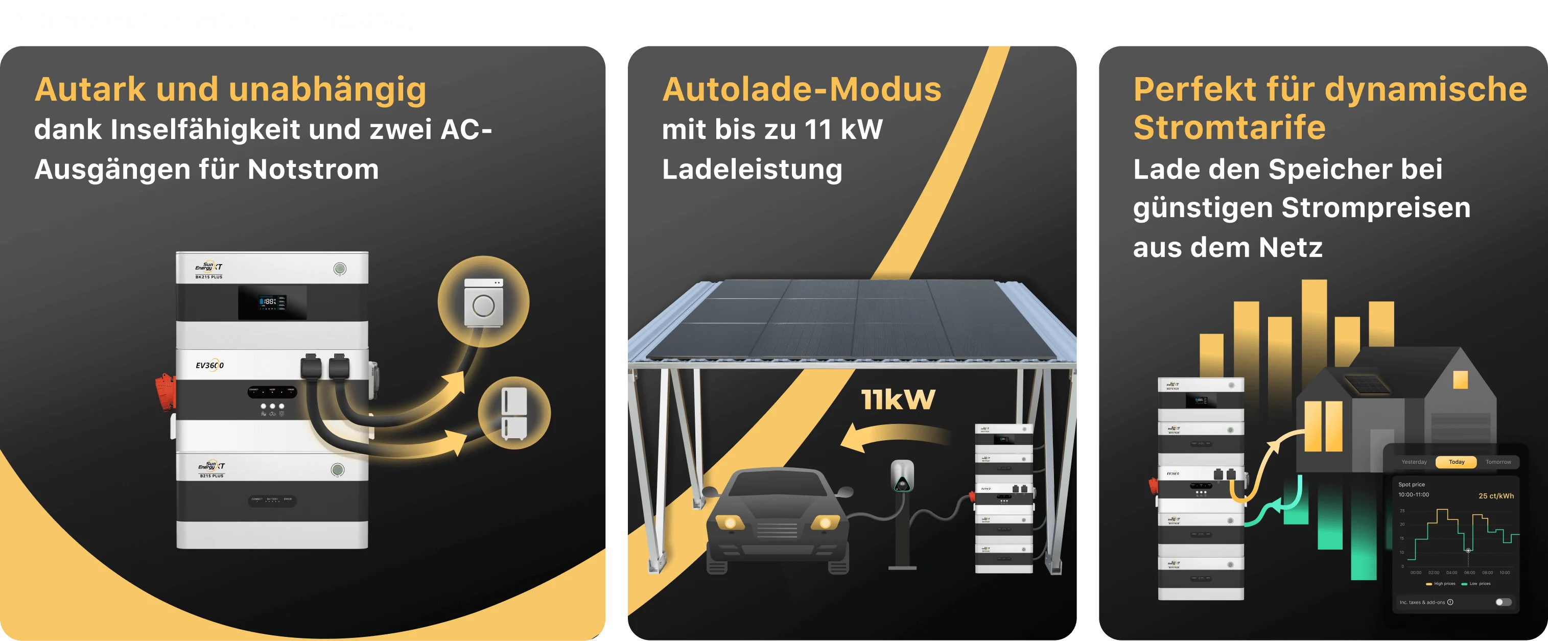 Perfekt in Kombination mit dem SunEnergyXT Carport: Mit PV-Modulen, Speicher & EV3600 versorgst Du dein E-Auto, aber auch E-Bike, Werkzeuge oder sonstige Geräte – in Deiner eigenen autarken Inselversorgung