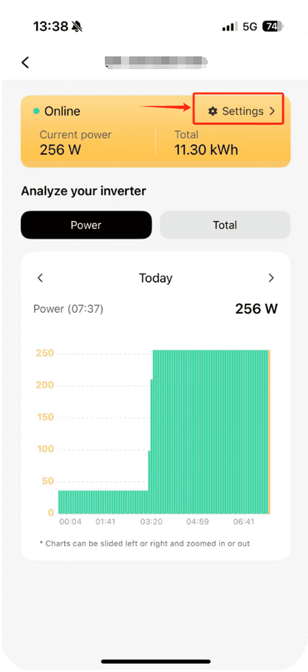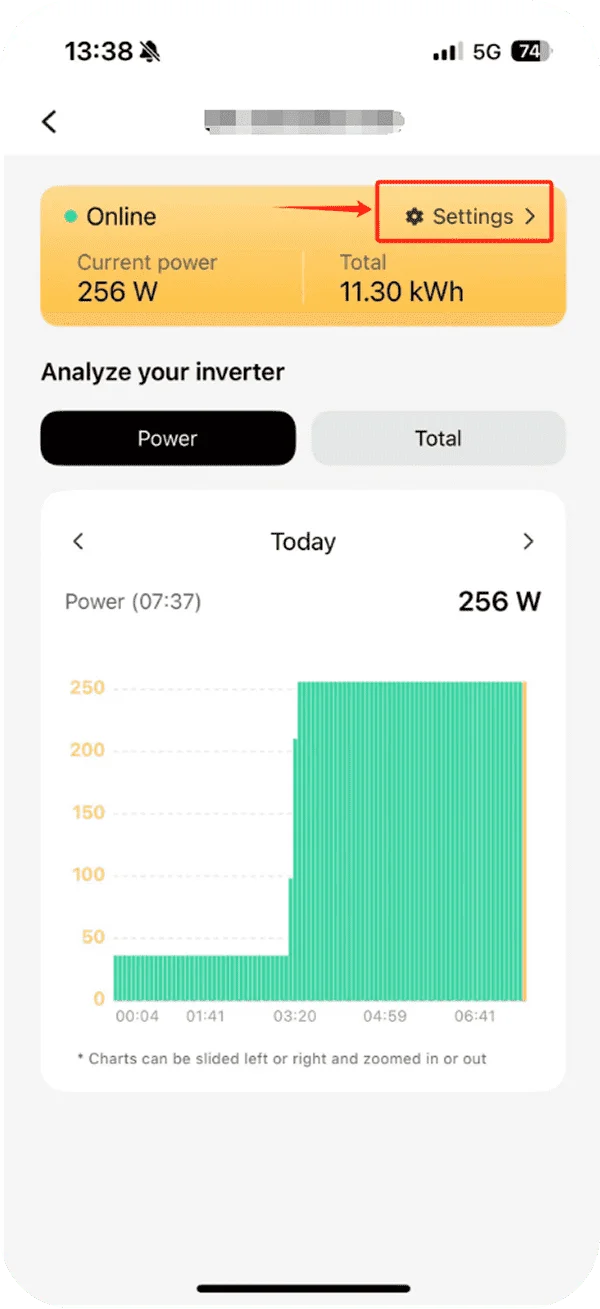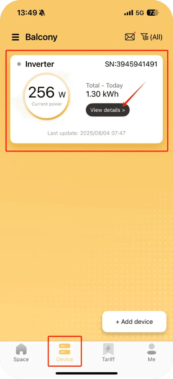 Open the SunEnergyXT App and go to the “Device” tab, then click the “View Details” button on your corresponding Deye inverter.