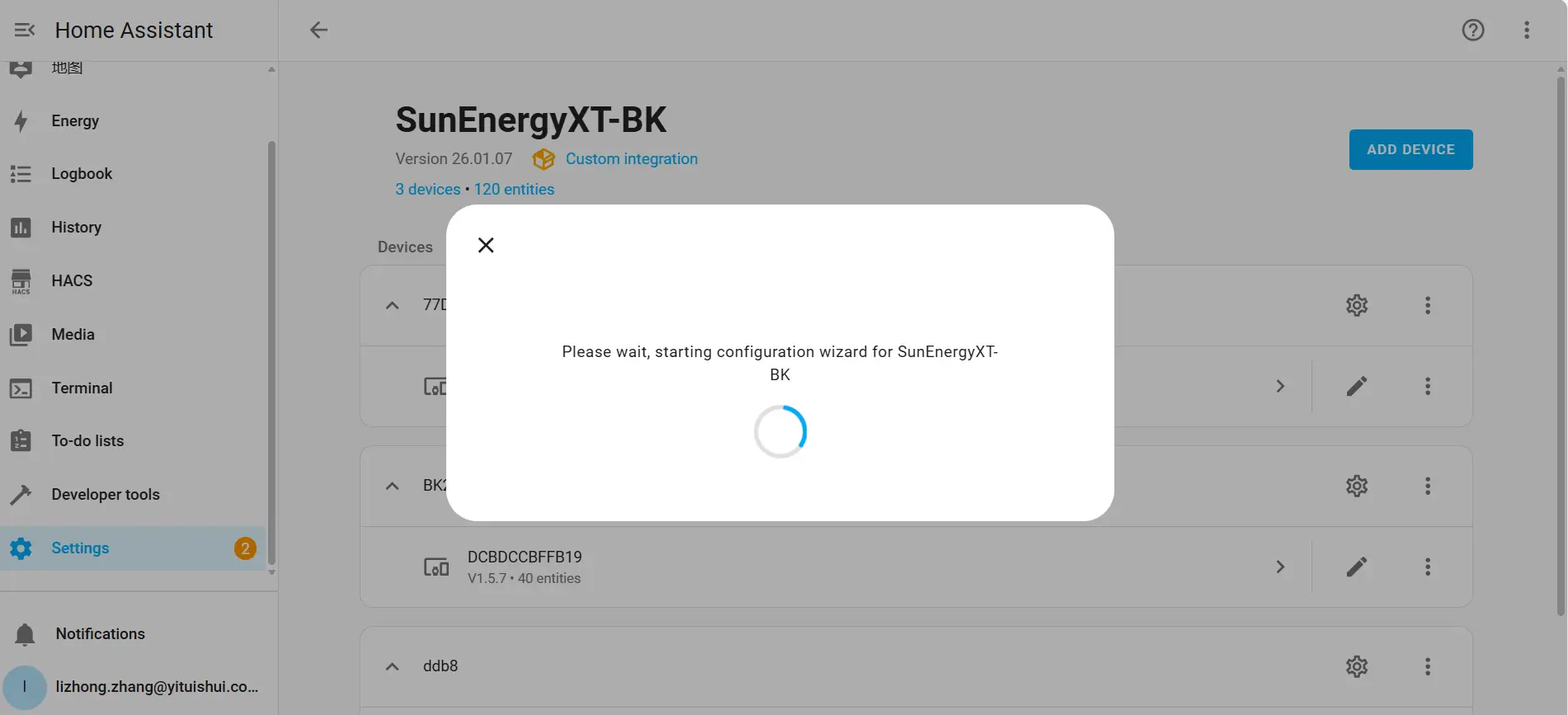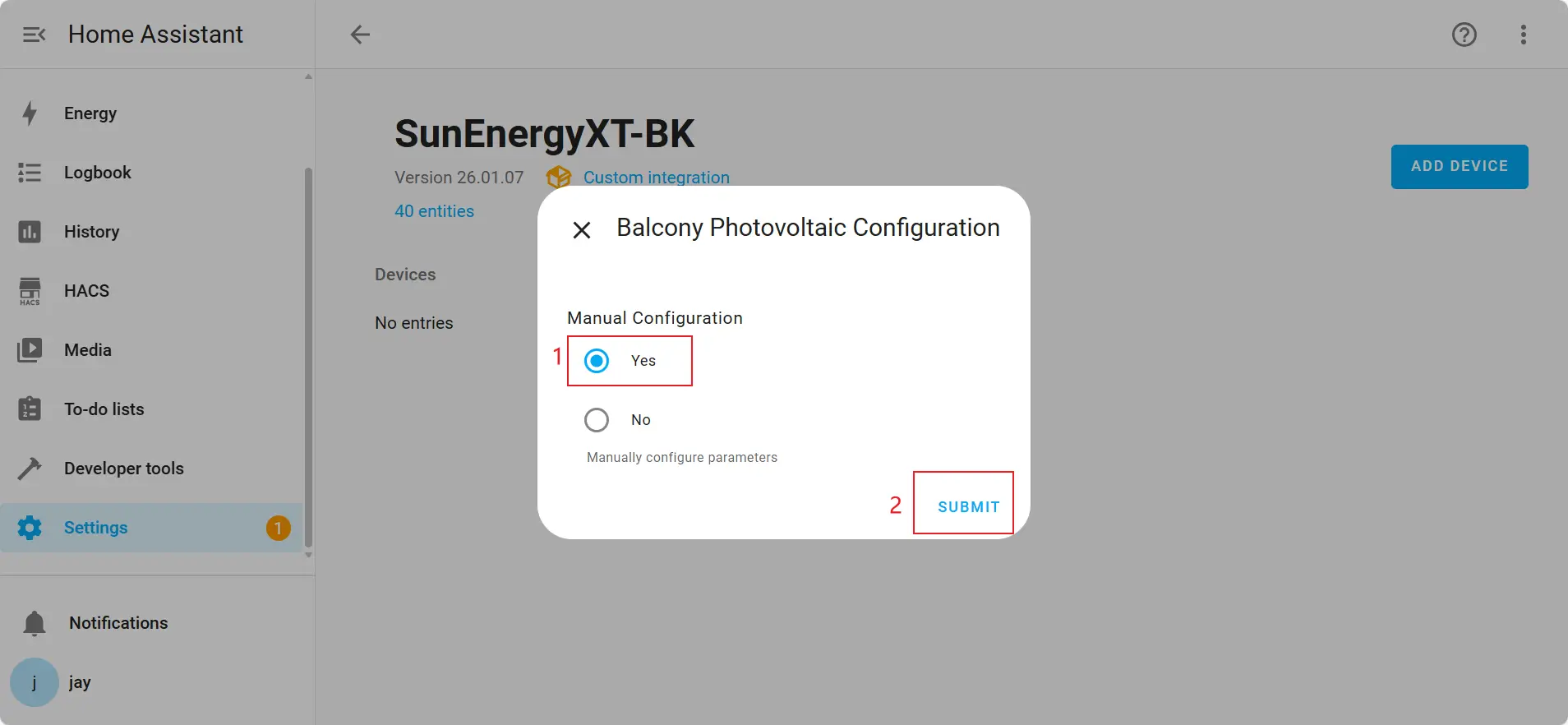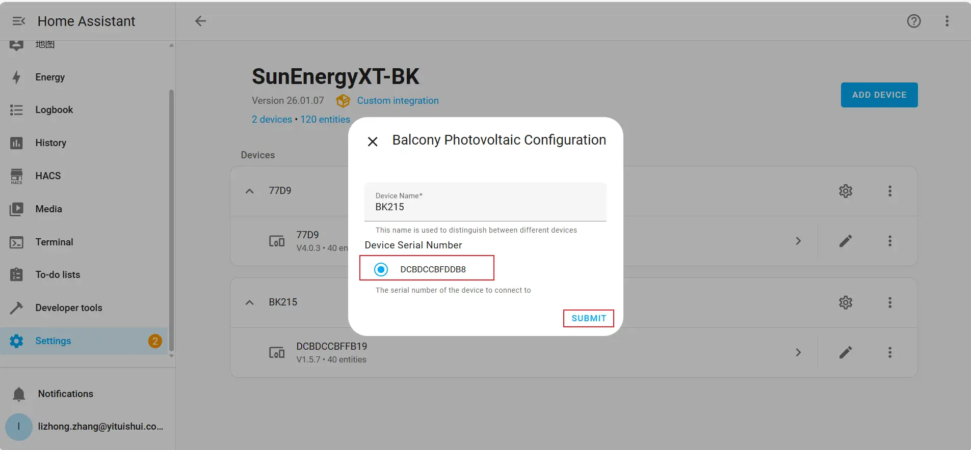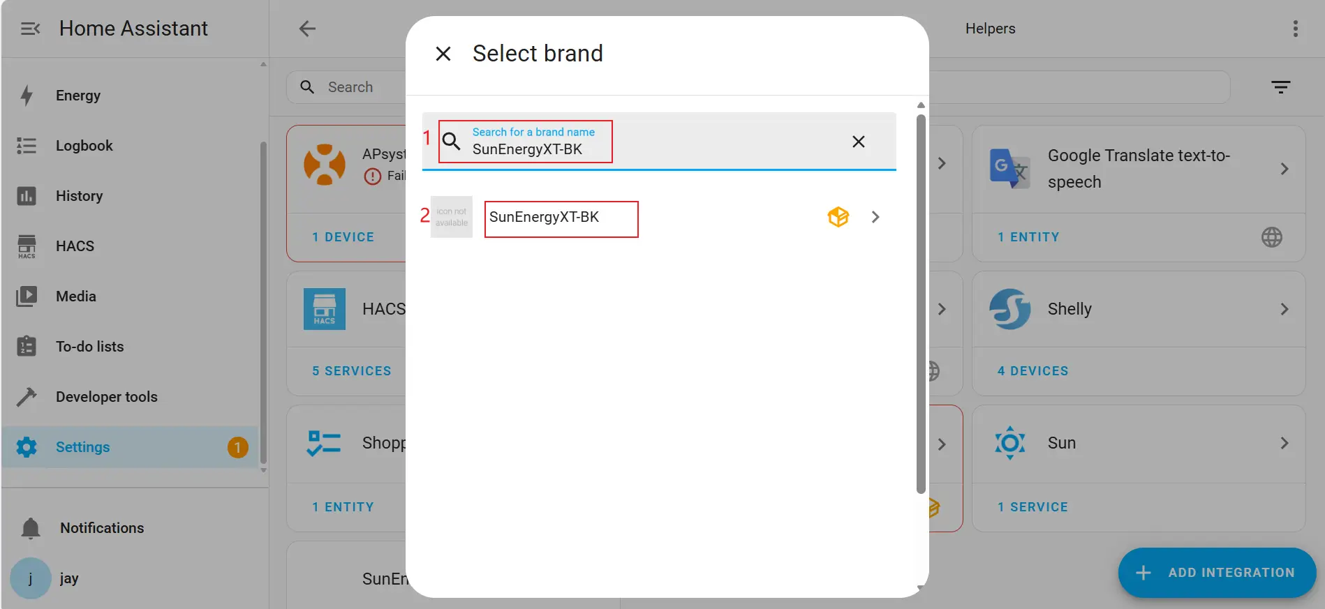 3. Search for "SunEnergyXT-BK" and select the SunEnergyXT-BK integration.