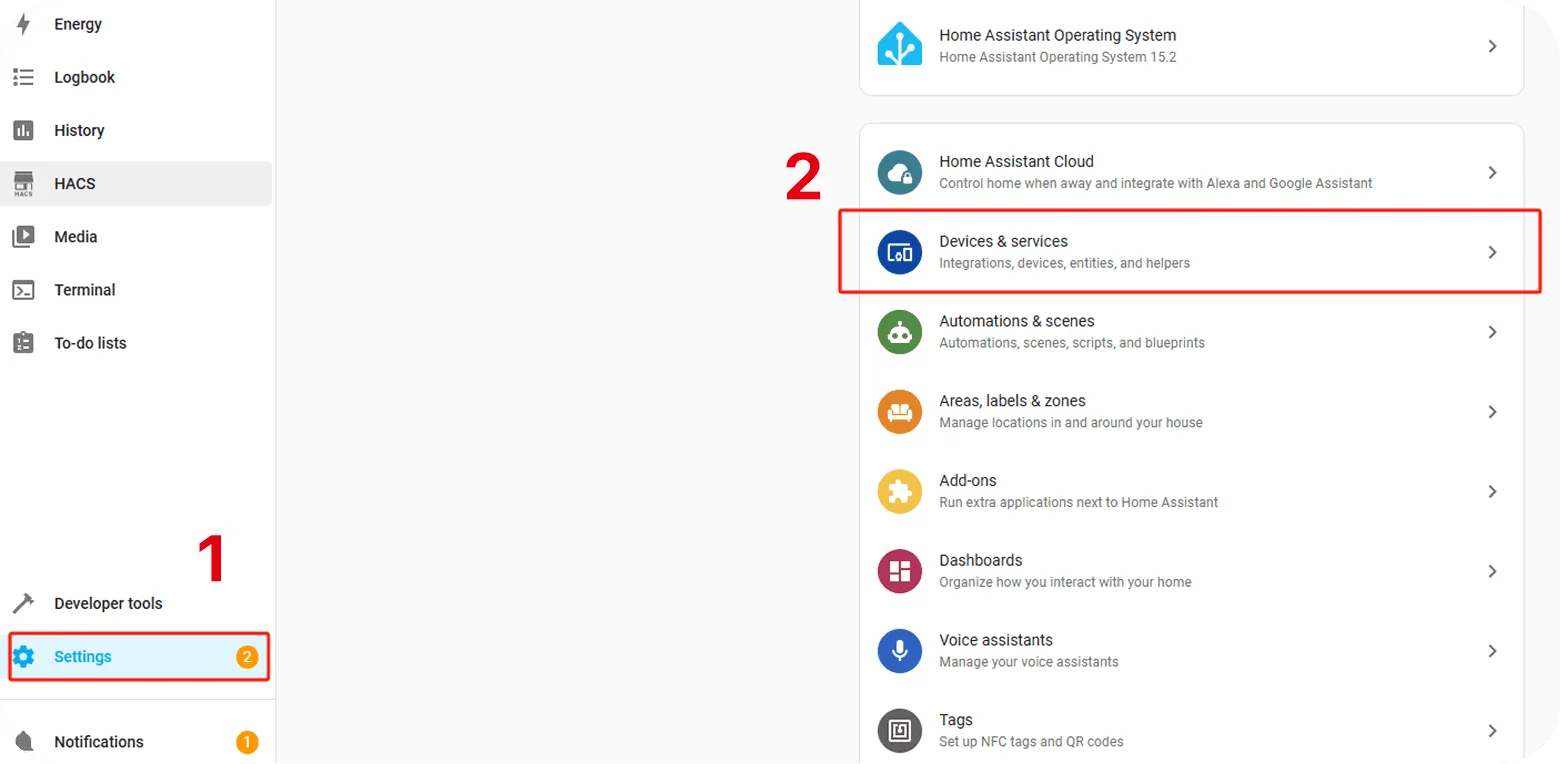 1. As shown in the image: Select "Settings" on the left side, then click on "Devices & services".
