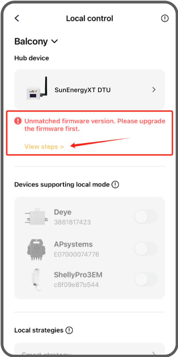 After adding the device, the system will verify the DTU firmware compatibility. If the firmware version isn't met, follow the in-app instructions to upgrade the firmware.