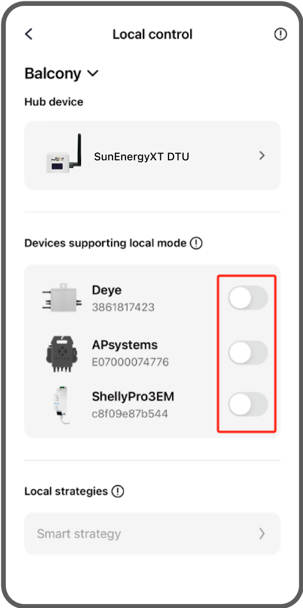 Toggle the device switch and follow the in-app instructions to enable the local mode of different devices.