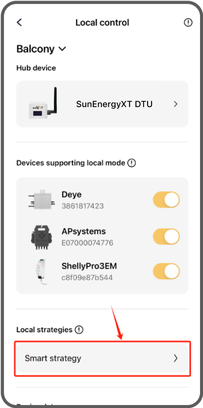To add the SunEnergyXT OpenDTU, please open the “Me” tab in your SunEnergyXT app. Then select the “Local control” category. Click on the DTU image and follow the instructions in the app to add the DTU to the app.